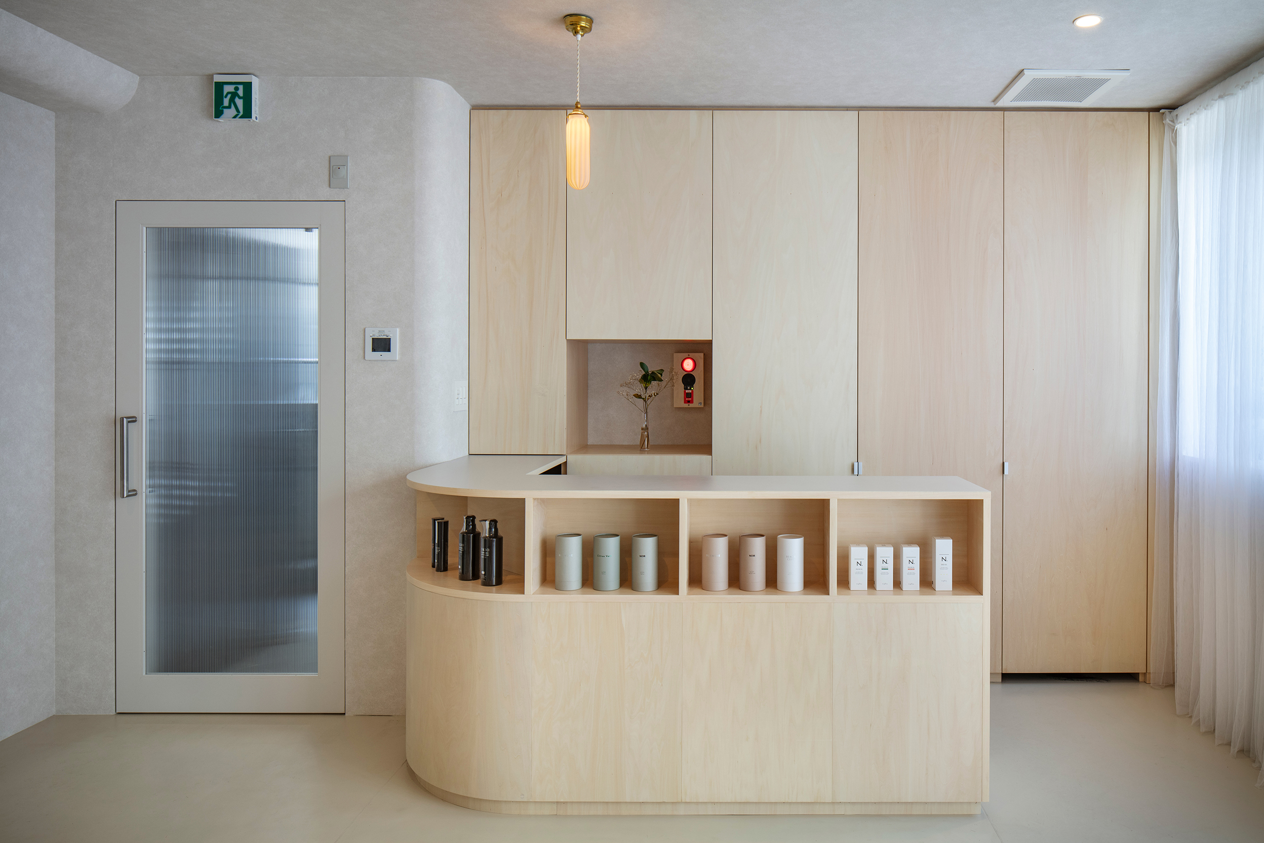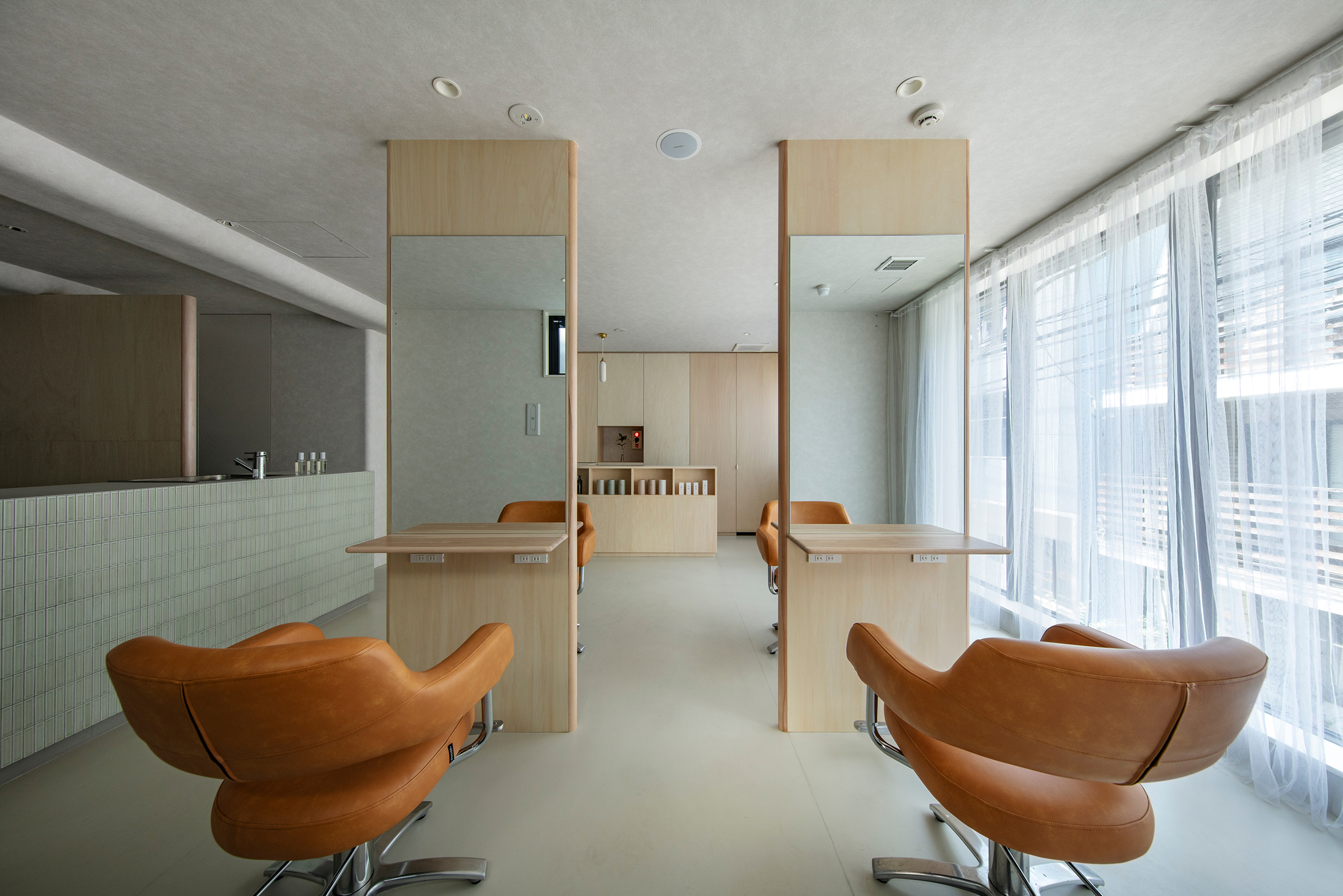 造作家具のシナ合板はホワイト拭取り塗装とし、床やカウンターのタイルなど、淡い色合いを選択した。窓際には薄いカーテンを、襞を重ねるようにかけ、都市の雑多な情報から距離を取った。