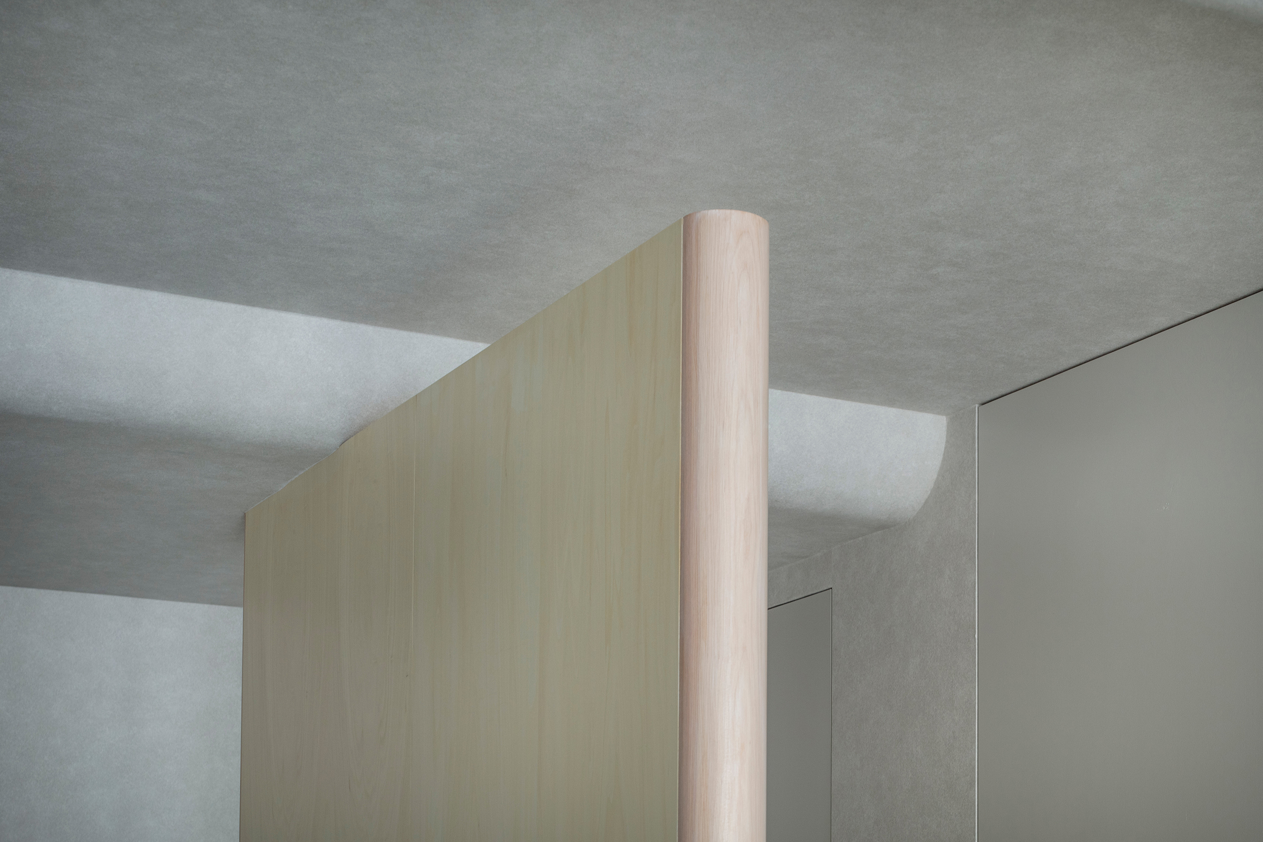 これらの情報を弱めることを考えた。面同士の境目である出隅は、通常であれば角が立ち、空間の輪郭として現れる。柱や梁、壁、家具も含めて、出隅に丸みを持たせることで境界線を曖昧にし、空間の輪郭をぼやかした。躯体の凸部も丸みを帯び、柔らかな襞がつくる母体に包まれるような空間となった。