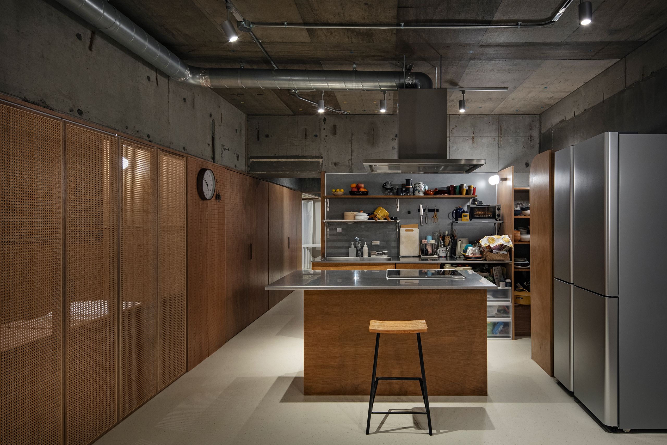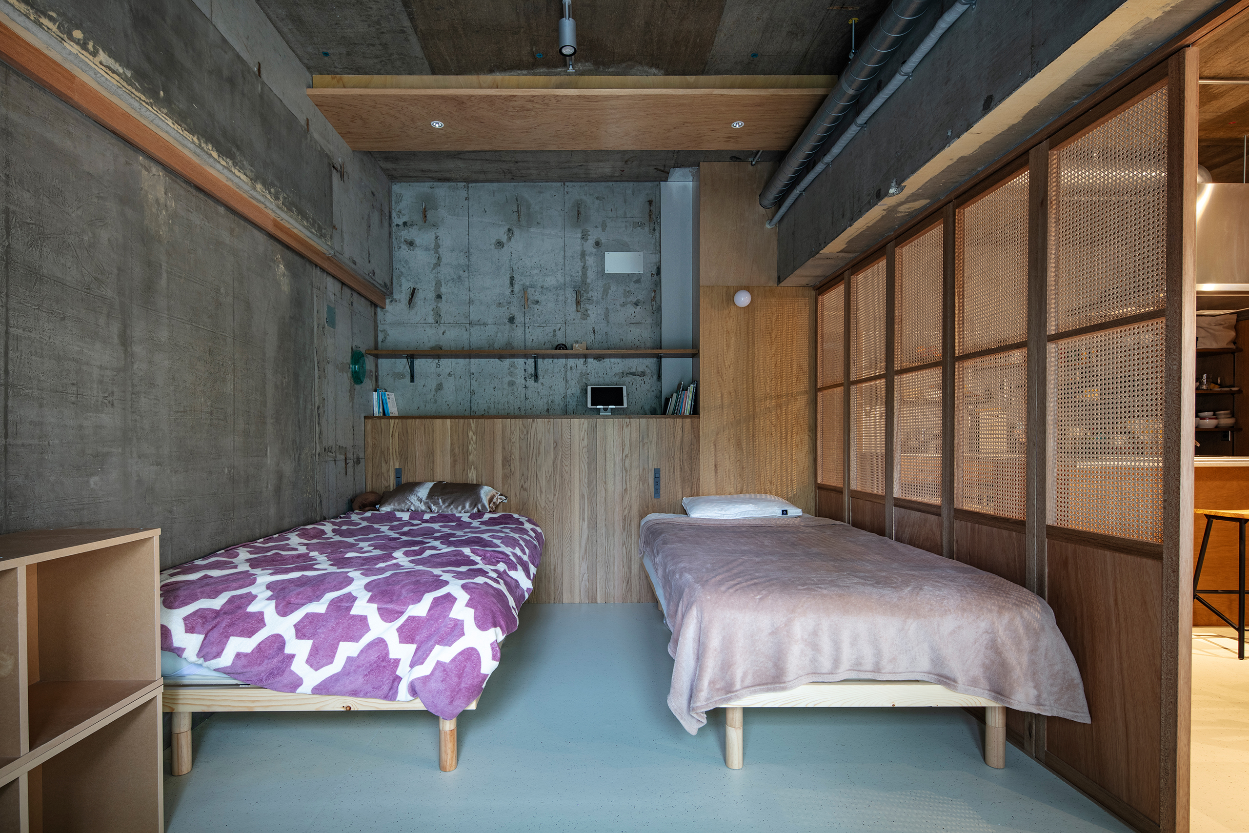 食事や就寝のためのキッチンやベッドボードは、梁から距離をとり、より身体に近いスケールにしている。
