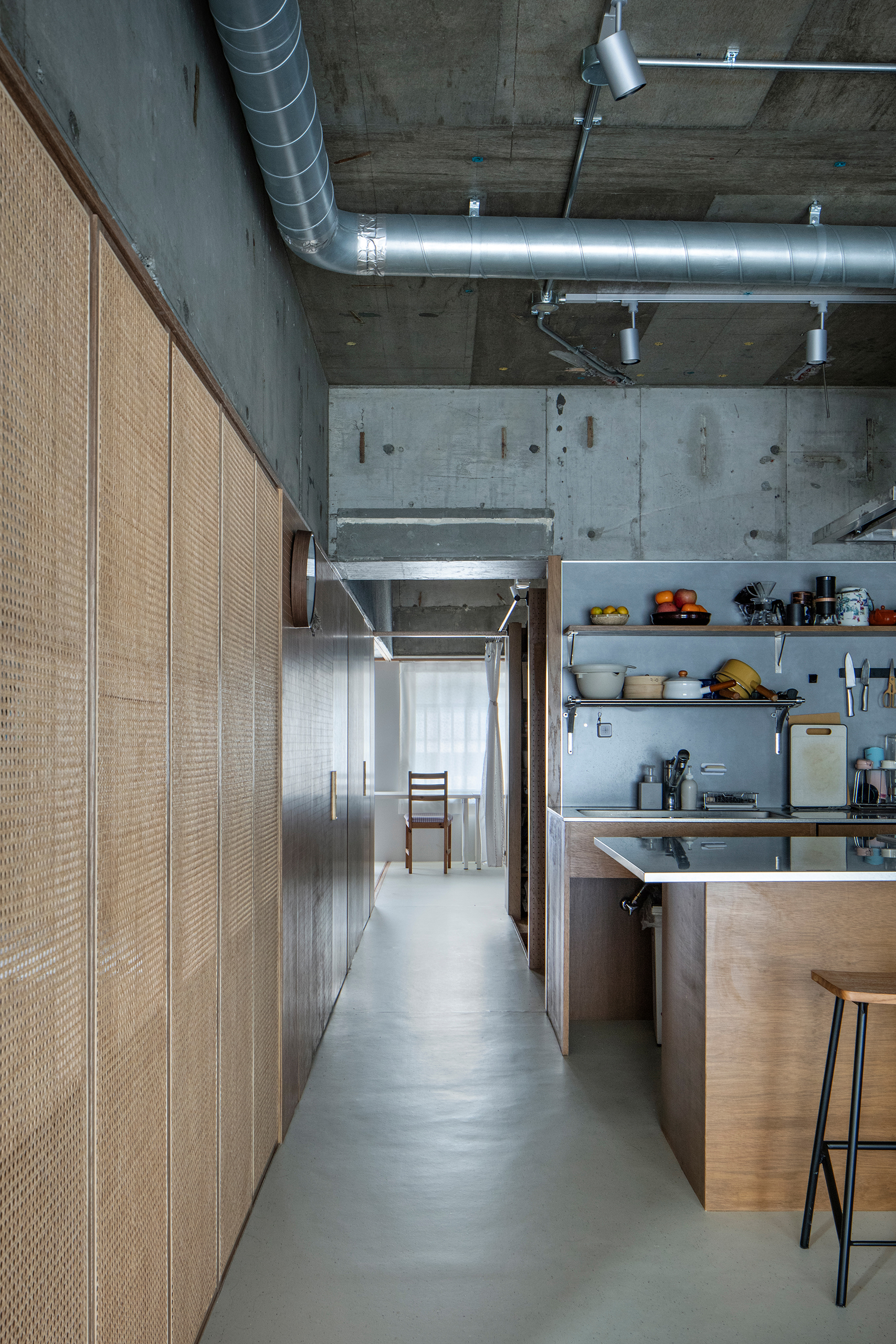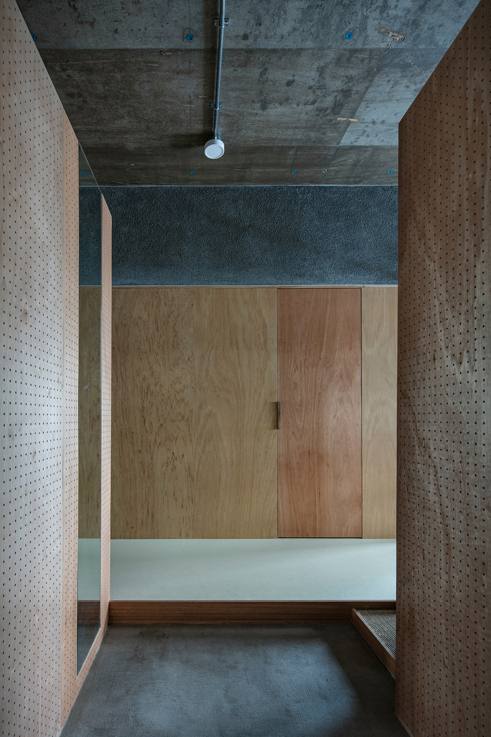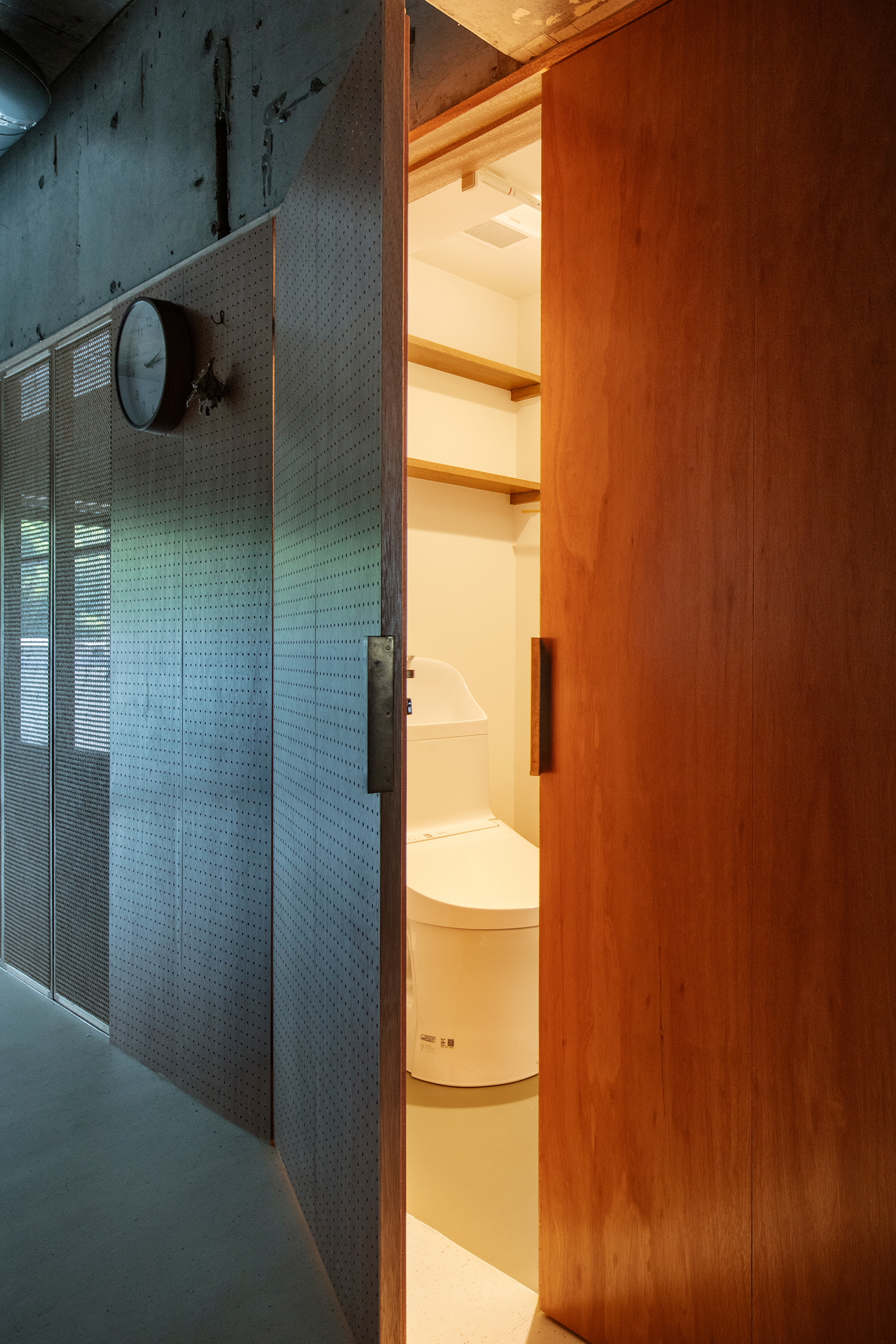 長手の梁下には鴨居を通し、ラタン貼りの扉、有孔ボード、ラワン壁、ラワン戸など、多様な素材で仕切を構成した。